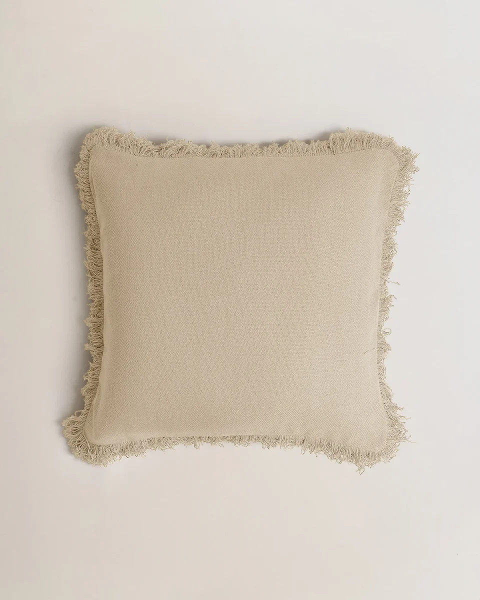 Cojín confeccionado en algodón. Tejido en espiga rematado con flecos en el contorno.