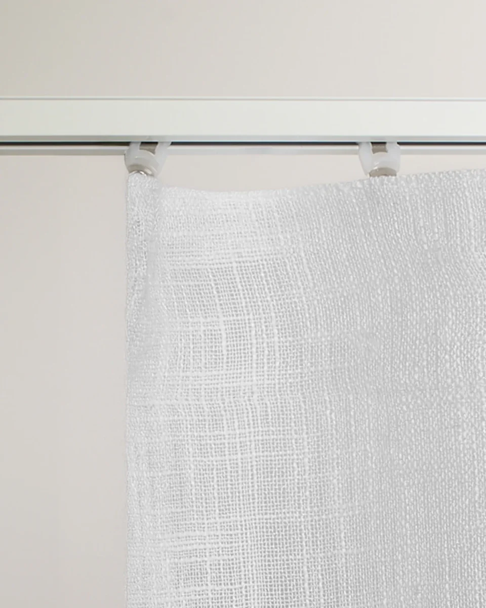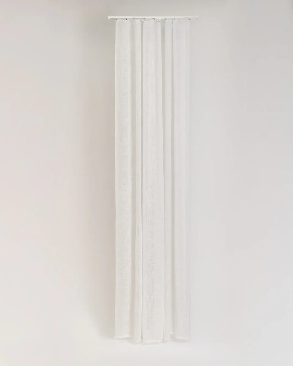 Cortina semitranslúcida para riel, ideal para filtrar la luz de forma suave y ganar privacidad sin perder claridad. Su caída aporta calidez a la decoración y convierte cualquier estancia en un espacio más confortable y equilibrado.