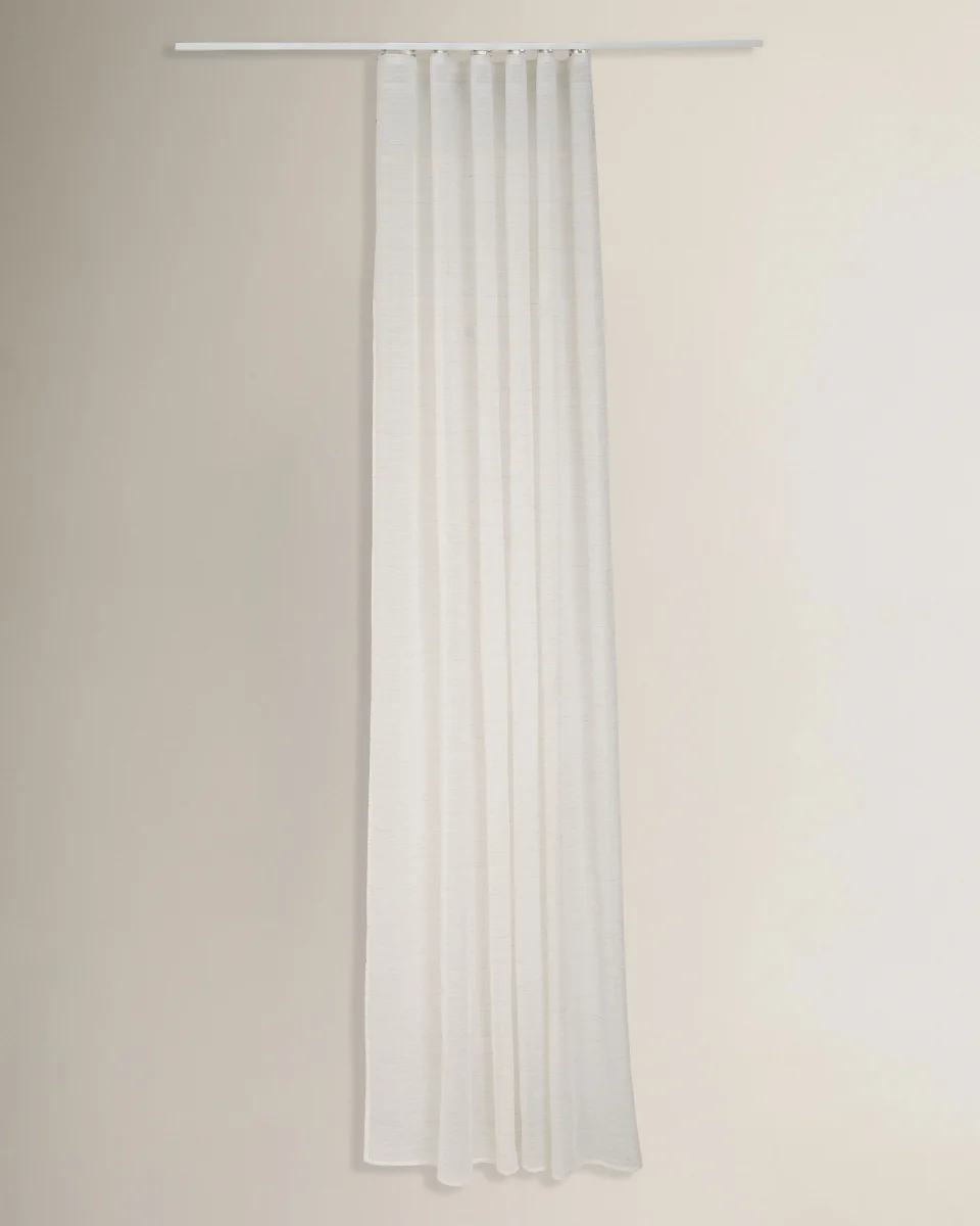 Cortina semitranslúcida pasa barra, ideal para filtrar la luz de forma suave y ganar privacidad sin perder claridad. Su caída aporta calidez a la decoración y convierte cualquier estancia en un espacio más confortable y equilibrado.